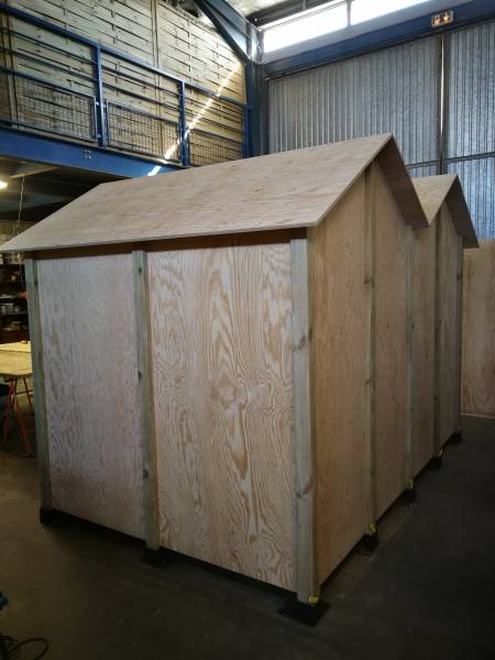 - Panneau bois brut contreplaqué ext. multiplis pin maritime CTBX 18 mm, poteau 90 x 90 mm pin autoclave, l'ensemble à traiter ou à peindre.