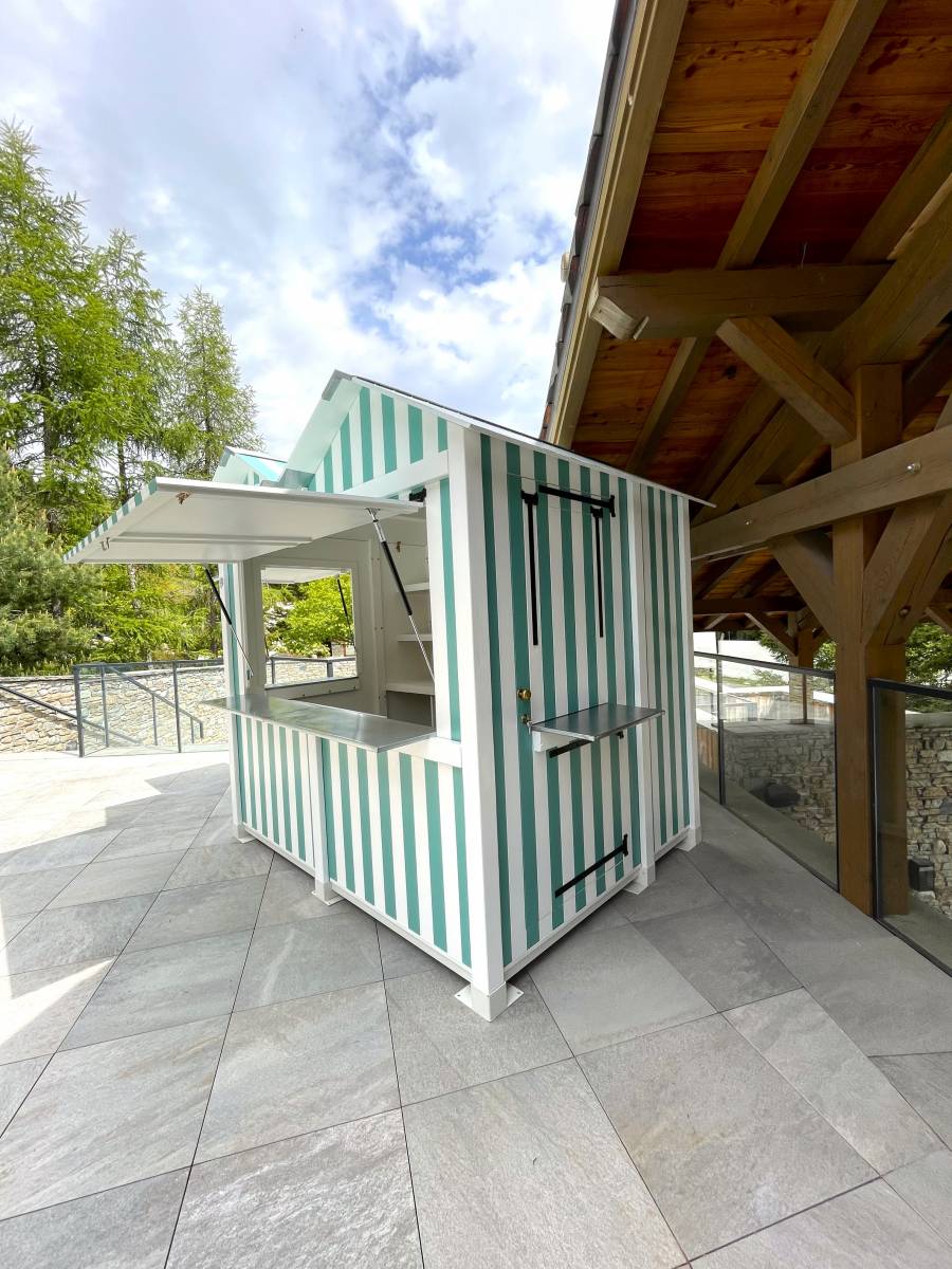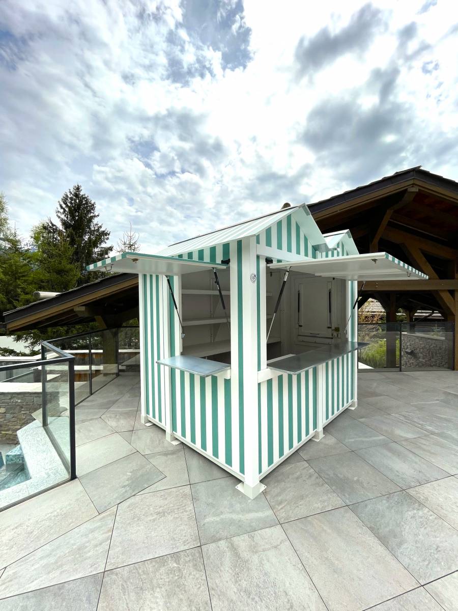 Habillée de rayures blanches et vert émeraude, la cabine apporte une touche fraîche et chic, en parfaite harmonie avec le cadre alpin et le bleu scintillant de la piscine.