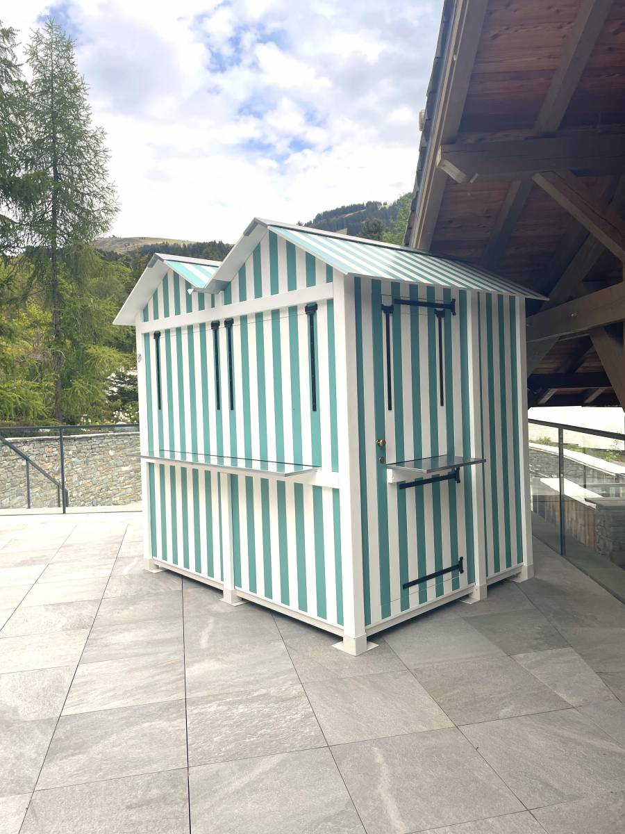 Au cœur des Alpes, au prestigieux Four Seasons Megève, une création signée Les Petites Maisons de l’Isle s’installe avec panache : une cabine double et demi de 4,7 m², pensée pour le bord de la piscine et le plaisir des beaux jours.