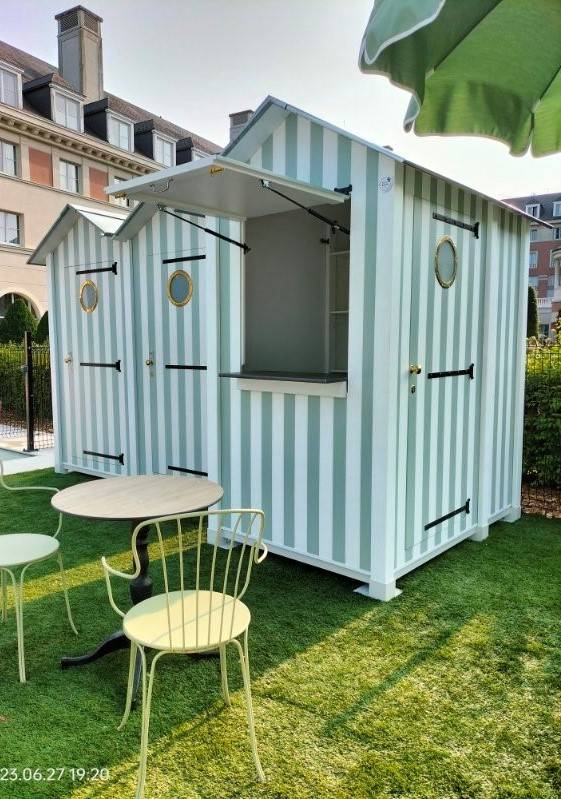 La cabine kiosque bar permet à un employé placé à l'intérieur de distribuer les serviettes de bain.